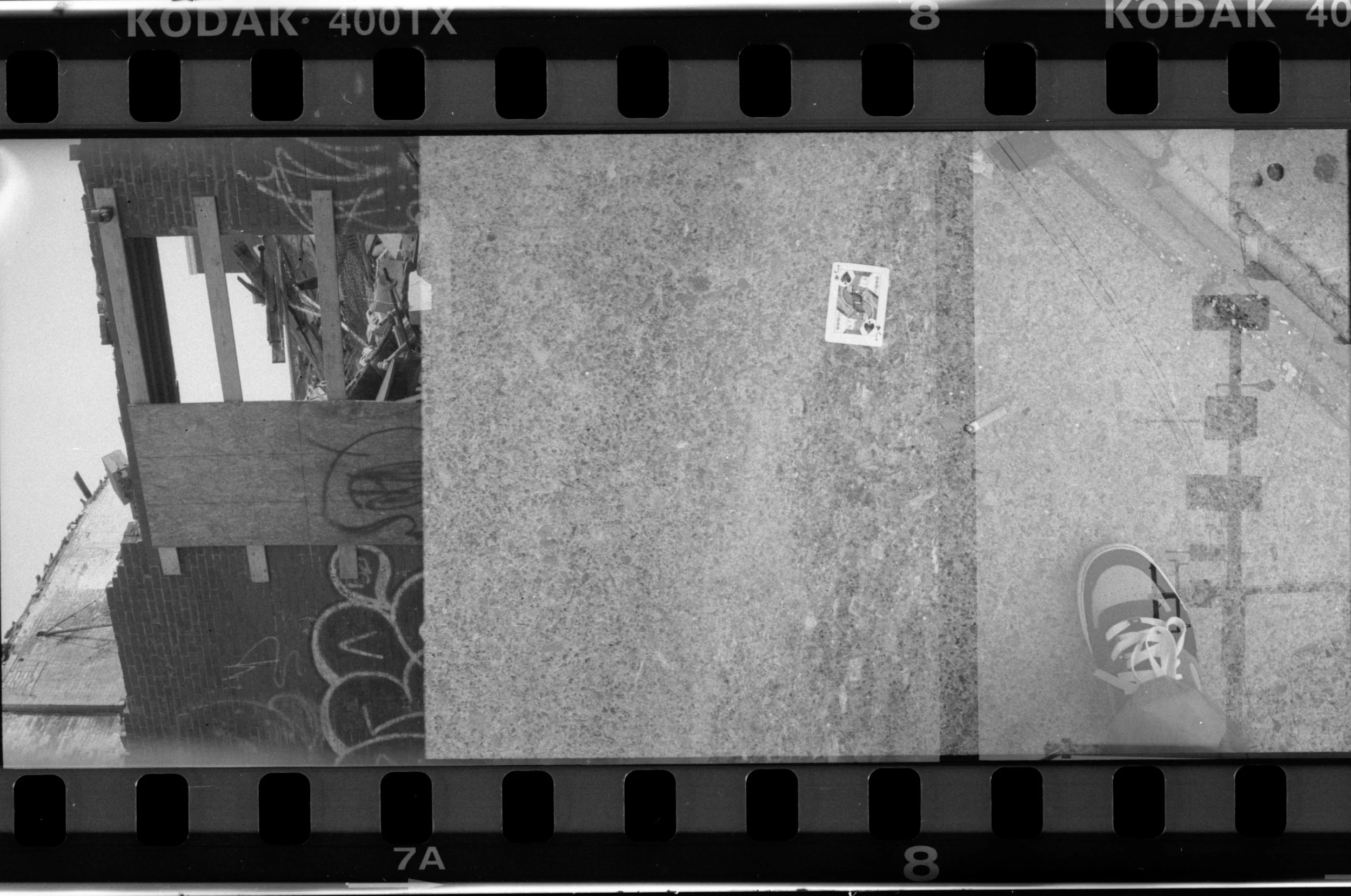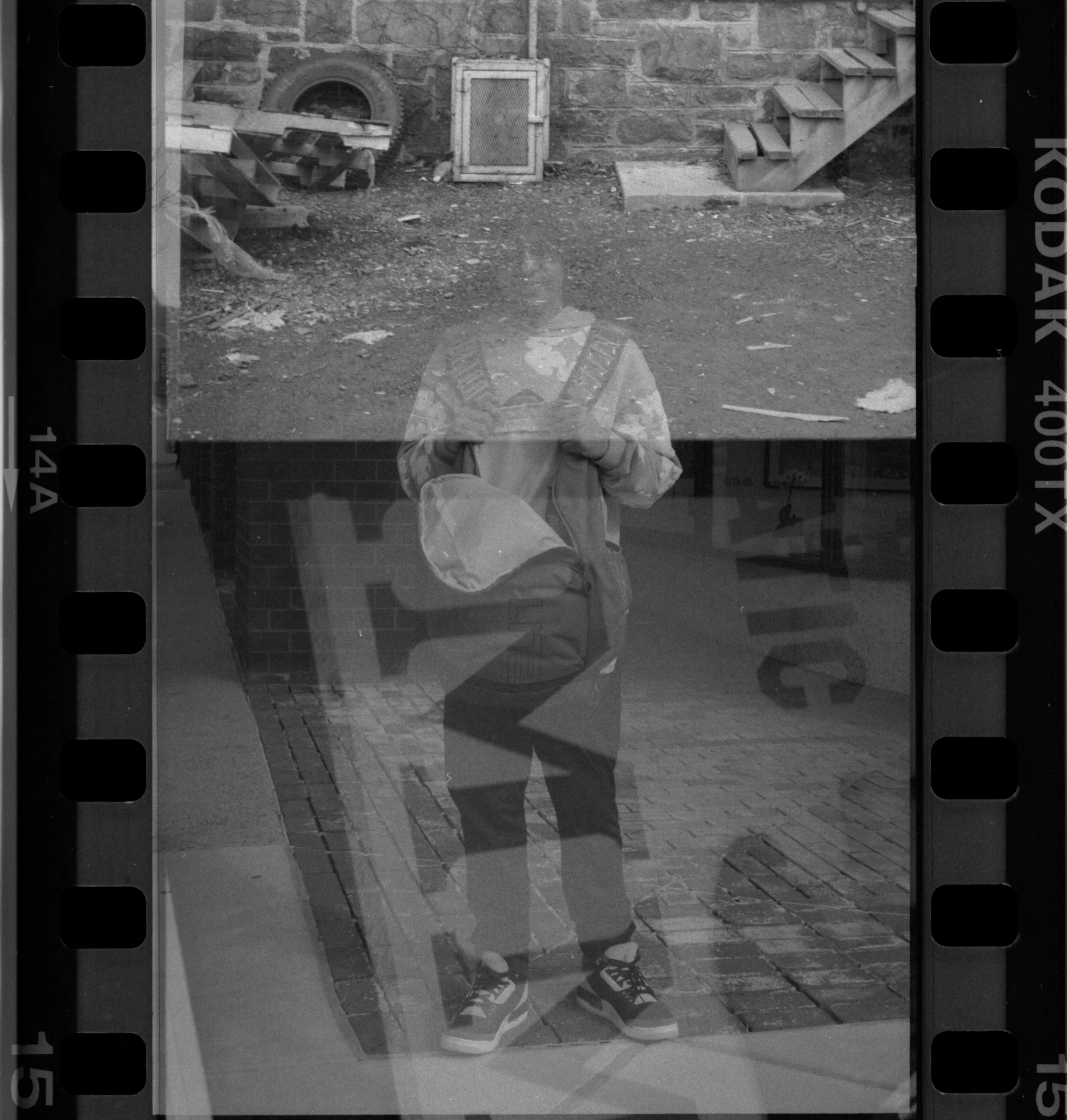 Parts of the images blend together making it difficult to decipher what’s what. Since I re-shot the roll very recently I remember what the newer exposures look like, which helps me pick out the original exposures. There are little clues that signify I shot this rather than it being an orphaned roll: shoes in the one of the shots look like mine, some of the framing & composition look like mine, at least from that era. So I’m confident that I shot this roll over a decade ago and then accidentally re-shot it a few days ago!